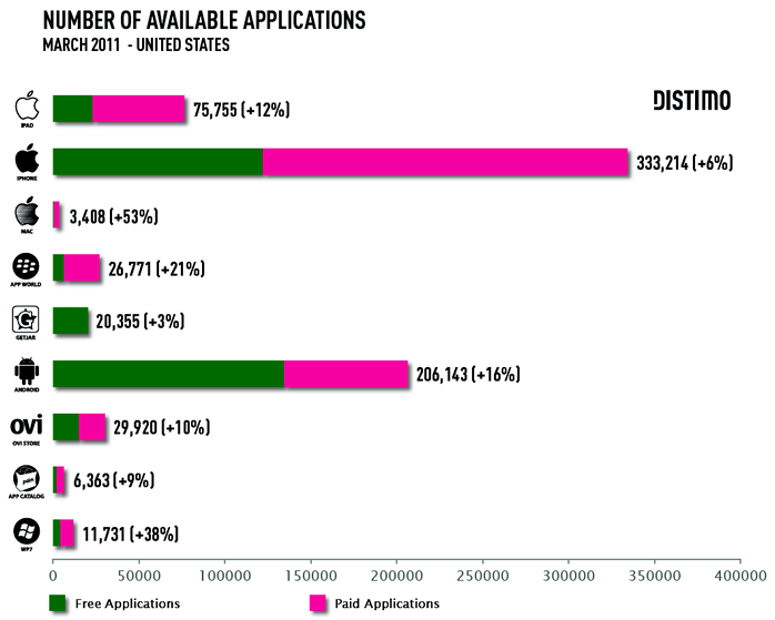 Camaltec APPS le ofrece soporte para que pueda beneficiarse de sus ideas, vendiendo sus aplicaciones en las diferentes plataformas móviles en las que le ofrecemos soporte. En la siguiente gráfica puede observar el número de aplicaciones gratuitas y existentes en USA en Marzo de este año: Cómo se puede observar existen plataformas con mas o menos APPs, teniendo en cuenta que % de aplicaciones de pago con respecto al total se pueden sacar conclusiones exactas sobre que plataformas son más rentables para la venta de aplicaciones. También se pueden sacar conclusiones sobre el crecimiento de cada una de las plataformas