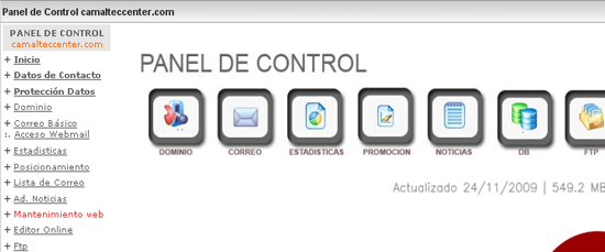 - Accediendo a su panel de cliente de Camaltec con su nombre de usuario y contraseña (/) y haciendo clic sobre el Panel de Control del dominio sobre el que desea trabajar, se abrirá una ventana donde aparece un menú en la parte izquierda de la pantalla.